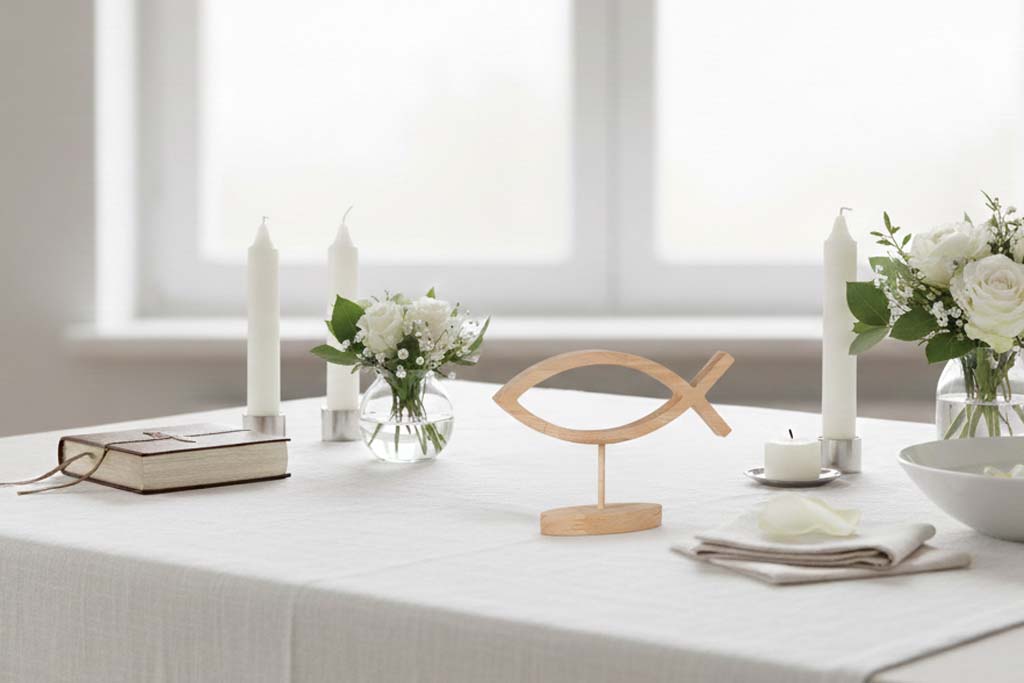 Dieser wunderschöne Christenfisch aus Holz ist das perfekte dekorative Element für Ihre festliche Tafel. Ob zur Taufe, Konfirmation, Kommunion oder Firmung – dieser elegante Deko-Aufsteller setzt einen feierlichen Akzent und unterstreicht die Bedeutung des Anlasses. Mit seiner schlichten, aber dennoch ausdrucksstarken Form fügt sich der Christenfisch harmonisch in jede Tischdekoration ein und wird garantiert zum Blickfang.