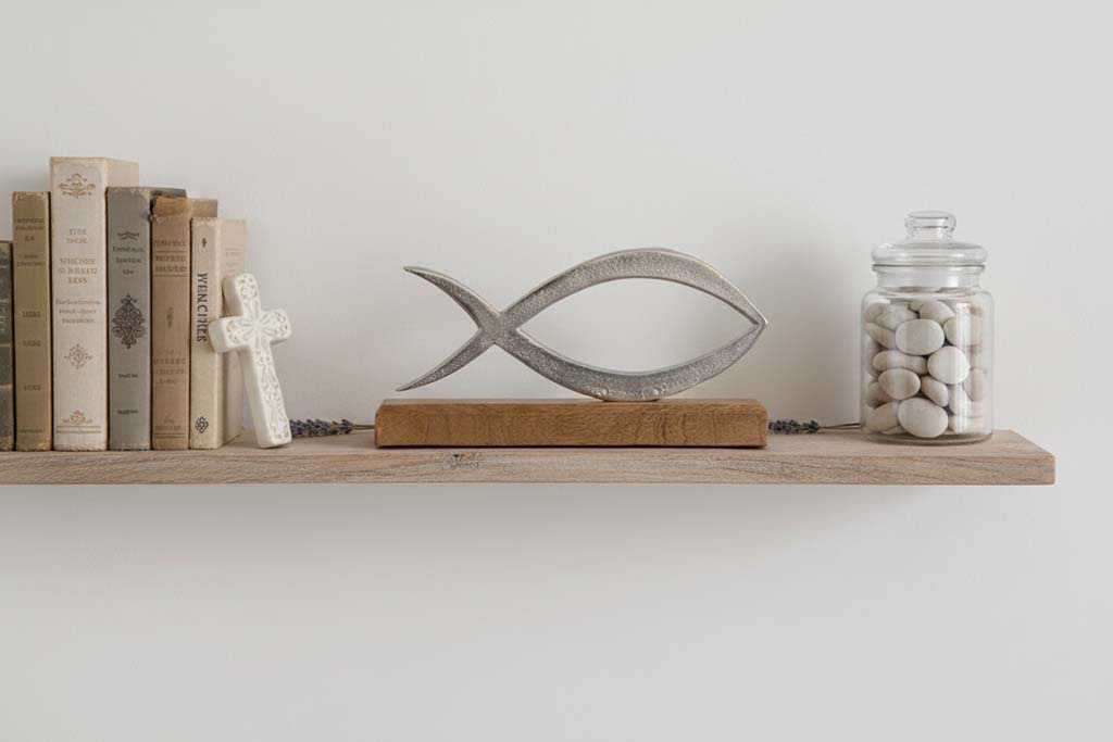 Dieser wunderschöne Christenfisch aus Metall auf einem stabilen Holzsockel ist ein perfektes dekoratives Element für Ihre festliche Tafel. Ob zur Taufe, Konfirmation, Kommunion oder Firmung – dieser Deko-Aufsteller ist ein wahrer Eyecatcher und verleiht jeder Feierlichkeit eine elegante und symbolische Note. Die Kombination aus dem schlichten Metallfisch und dem natürlichen Holzsockel schafft eine harmonische und stilvolle Optik, die ideal zu religiösen Anlässen passt. Ein besonderes Highlight für Ihre Dekoration und ein bedeutungsvolles Element für besondere Momente.