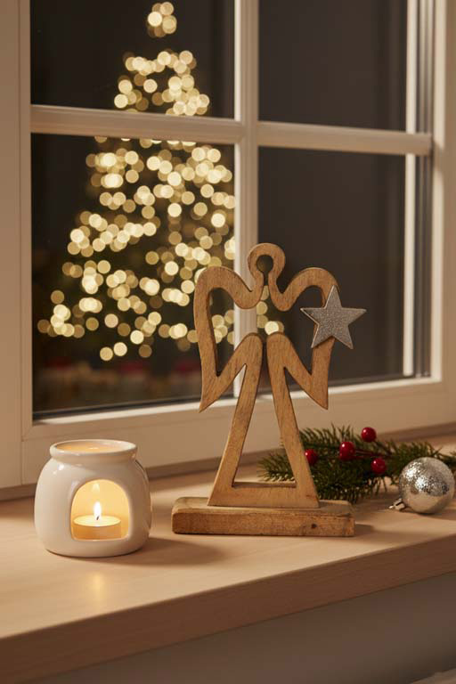 Der filigrane Metallstern des Engels harmonisiert mit dem warmen Holz, was die Dekoration besonders ansprechend macht.