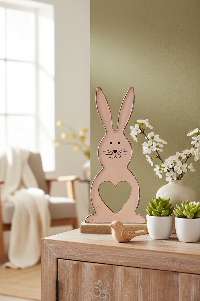 Der Osterhase aus Metall besticht durch sein filigranes Design und das ausgestanzte Herz auf der Vorderseite, das dem Stück eine liebevolle und verspielte Note verleiht. Der Holzsockel sorgt für sicheren Stand und fügt sich perfekt in das harmonische Gesamtbild ein.