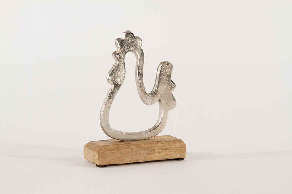 Der Holzsockel sorgt für einen sicheren Stand. Das Metallhuhn eignet sich perfekt als dekoratives Element zu Ostern auf dem Tisch, Regal oder in der Vitrine und wird garantiert zum Blickfang in jedem Raum.