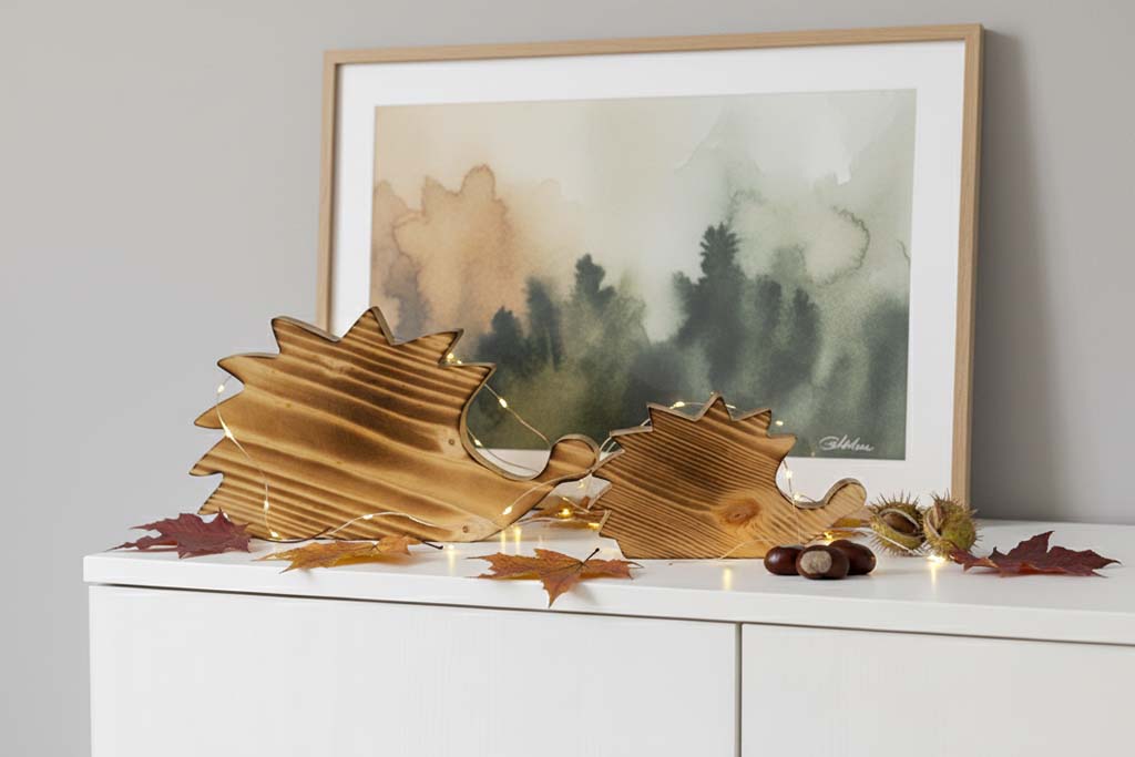 Dieser dekorative Aufsteller in Form eines Igels ist eine charmante Herbst- oder Winterdekoration, die in jedem Raum für eine gemütliche, rustikale Atmosphäre sorgt. Der Igel wurde in Handarbeit aus Kiefernholz gefertigt und ist in einer geflammten Optik gehalten, die ihm eine natürliche, warme Ausstrahlung verleiht. Das geflammte Kiefernholz bringt eine rustikale Eleganz, die perfekt zur Herbst- und Winterzeit passt. Der Igel eignet sich hervorragend als Dekoration für den Tisch, das Regal oder die Fensterbank und fügt sich harmonisch in verschiedene Einrichtungsstile ein. Ein ideales Geschenk oder eine Zusatzdekoration, um Ihr Zuhause mit einer natürlichen und liebevollen Note zu bereichern und die Herbst- und Winterstimmung zu unterstreichen.