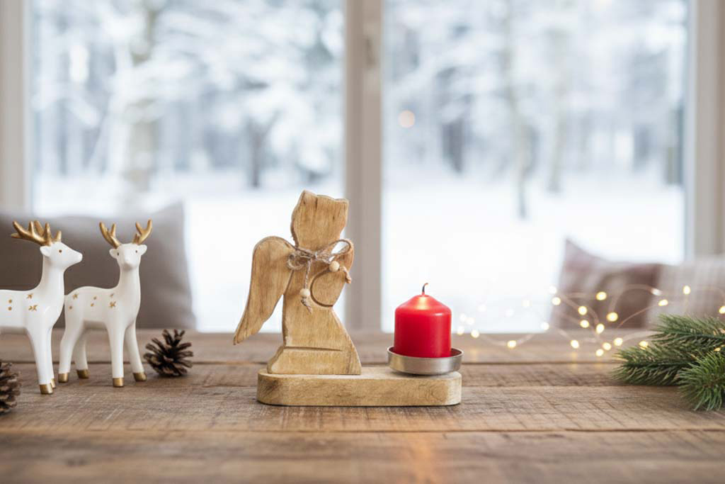 Dieser wunderschöne Weihnachtsengel aus hochwertigem Mangoholz bringt festliche Stimmung in Ihr Zuhause. Der dekorative Engel ist mit einem Kerzenhalter aus Metall ausgestattet und wird durch einen Stern sowie ein zartes Deko-Band liebevoll verziert. Der Kerzenhalter hat einen Durchmesser von ca. 7 cm und eignet sich für normale Teelichter, Maxi-Teelichter oder Stumpenkerzen.