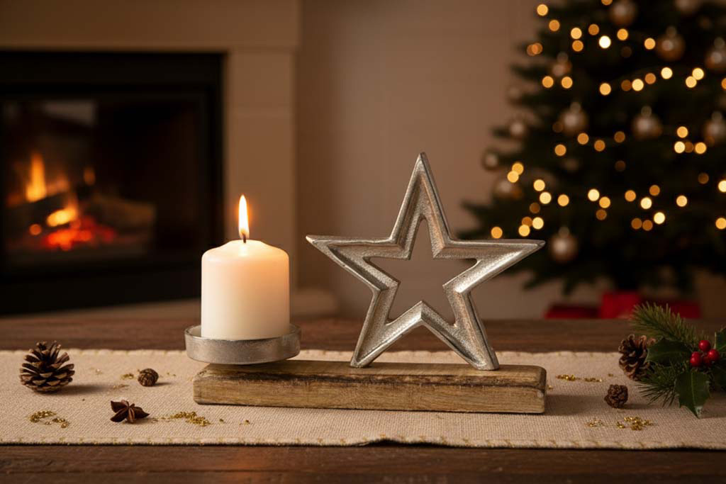 Der Stern aus robustem Metall verleiht diesem Kerzenhalter eine moderne und zugleich festliche Ausstrahlung. Mit seiner klaren, minimalistischen Form fügt er sich perfekt in Ihre Weihnachtsdekoration ein und sorgt für eine stimmungsvolle Atmosphäre, die Ihr Zuhause in weihnachtlichem Glanz erstrahlen lässt.