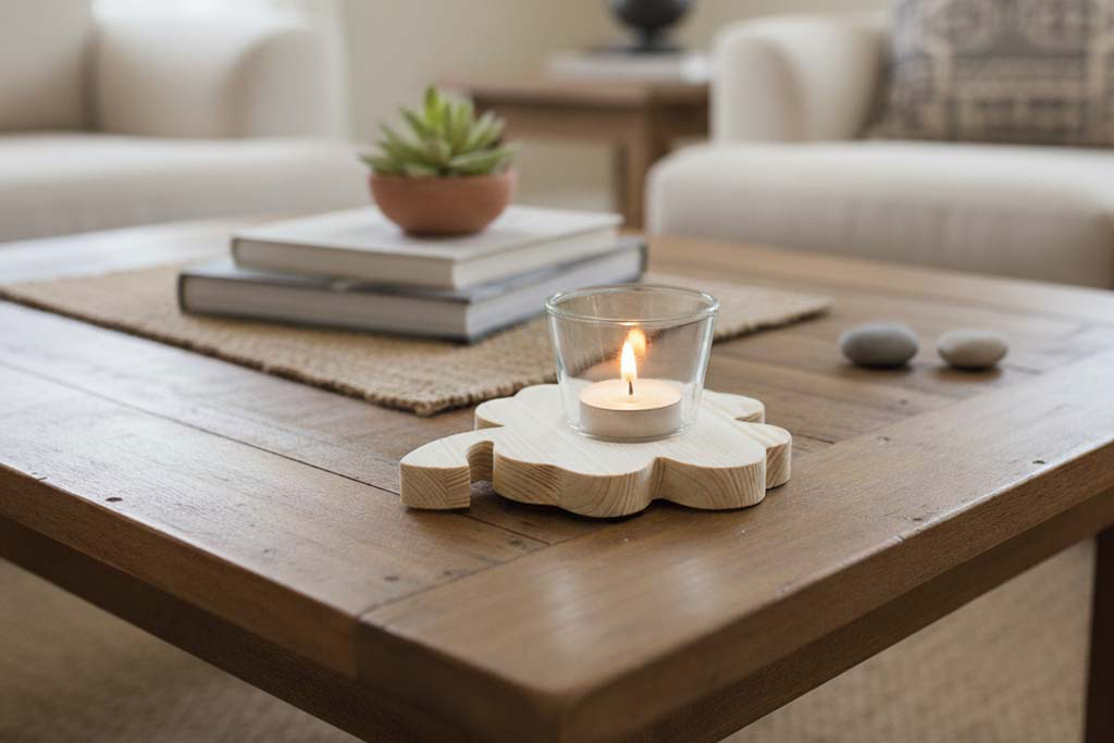 Dieser Teelichthalter aus Kiefernholz kombiniert natürliche Materialien mit kreativem Design und sorgt für eine behagliche und glücksbringende Atmosphäre in Ihrem Zuhause. Ein ideales Geschenk für alle, die besonderen Wert auf stilvolle, nachhaltige Dekoration legen.