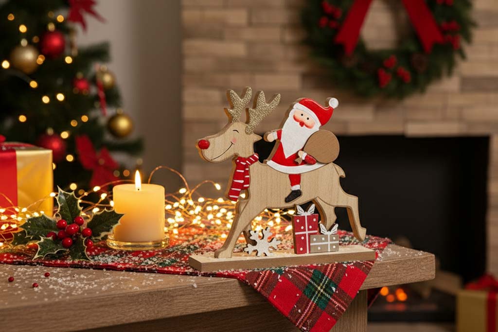 Der Weihnachtsmann ist in einem klassischen, aber dennoch charmanten Design gehalten. Mit seinem fröhlichen Gesicht, dem roten Mantel und seiner Mütze zieht er sofort alle Blicke auf sich. Das Rentier, ebenfalls detailliert ausgearbeitet, trägt den Weihnachtsmann elegant durch die winterliche Landschaft. Zusammen bilden sie ein zauberhaftes Paar, das die Vorfreude auf Weihnachten verstärkt.
