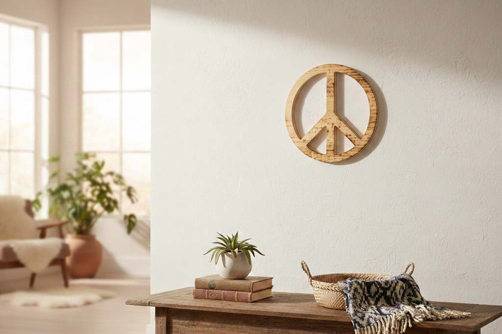Dieses stilvolle Peace-Zeichen aus unbehandeltem Kiefernholz ist eine wunderbare Dekoration, die sowohl in modernen als auch natürlichen Interieurs hervorragend zur Geltung kommt. Die authentische Holzoptik bringt eine rustikale, aber dennoch zeitlose Ausstrahlung in jedes Raumkonzept.