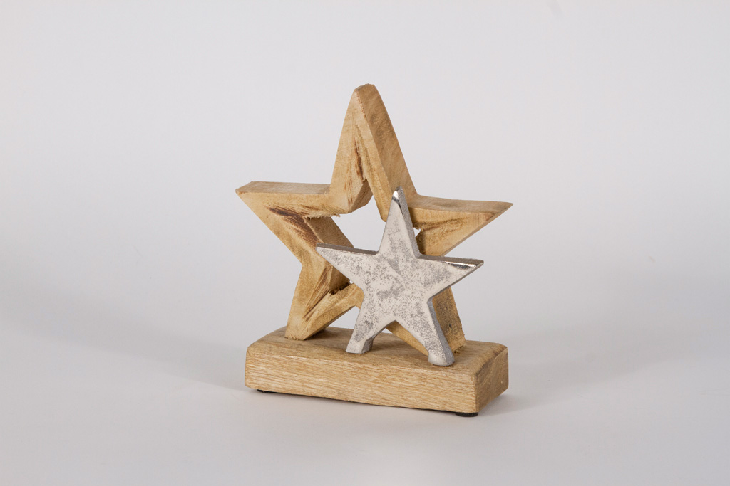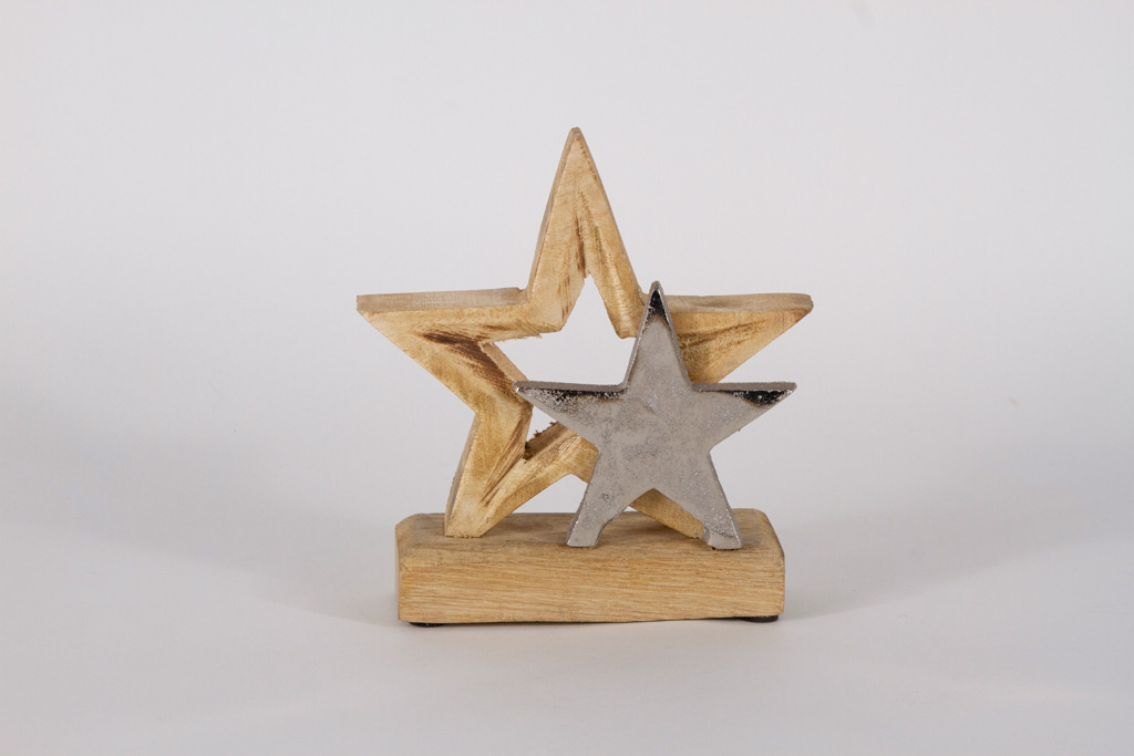 Verleihen Sie Ihrer Weihnachtsdekoration eine moderne und elegante Note mit diesem Weihnachtsstern aus Mangoholz und Metall. Das zeitlose Design vereint die natürliche Schönheit des Mangoholzes mit der modernen Ästhetik von Metall und schafft so einen stilvollen Blickfang in Ihrem Zuhause.