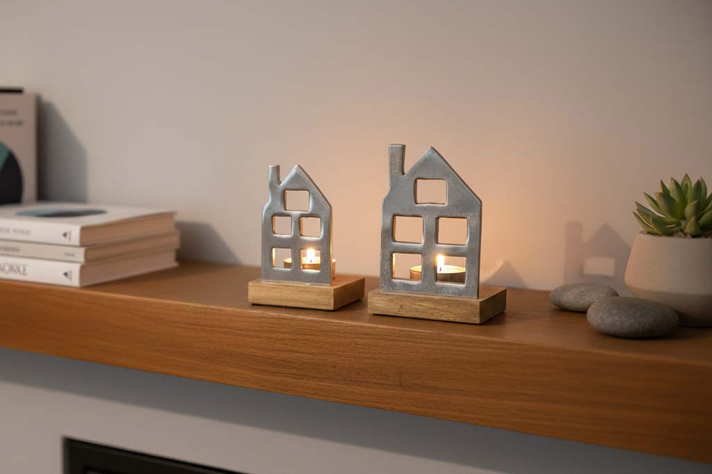 Der Teelichthalter aus Metall auf Holzsockel in Form eines Hauses ist ein wunderschönes und einzigartiges Dekorationsstück für Ihr Zuhause. Das Hausdesign verleiht ihm einen charmanten und gemütlichen Look, der perfekt in jeden Wohnraum passt. Hergestellt aus hochwertigem Metall, ist dieser Teelichthalter robust und langlebig. Das Metall ist sorgfältig verarbeitet und verleiht dem Teelichthalter eine elegante und moderne Optik. Der Holzsockel sorgt für zusätzliche Stabilität und verleiht dem Teelichthalter einen natürlichen und rustikalen Touch. Der Teelichthalter bietet Platz für Teelichter bis 6 cm Durchmesser, die eine warme und gemütliche Atmosphäre schaffen. Dieser Teelichthalter eignet sich perfekt als Tischdekoration, auf dem Kaminsims oder als Blickfang auf einem Regal. Er ist auch ein tolles Geschenk für Freunde und Familie, die ihren Wohnraum mit einem stilvollen und einzigartigen Accessoire aufwerten möchten. Geben Sie Ihrem Zuhause mit diesem Teelichthalter aus Metall auf Holzsockel in Form eines Hauses eine persönliche Note und genießen Sie die gemütliche Atmosphäre, die er schafft. Erhältlich in zwei Größen.
