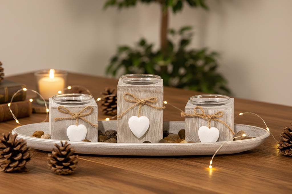 Die liebevolle Dekoration mit weißen Deko-Herzen aus Holz und passendem Deko-Kies fügt dem Set eine charmante und verspielte Note hinzu. Diese Details machen das Windlicht-Set zu einem wahren Hingucker und sorgen für eine romantische, behagliche Stimmung.